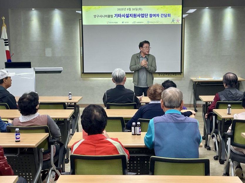 [2025. 9. 30.] 기타시설지원 사업단 참여자 간담회 페이지 정보 작성자 관리자 조회 38회 작성일 25-09-30 11:37 목록 본문 기타시설지원 사업단 참여자 간담회가 30일 오전 11시에 양구여성회관 3층 회의실에서 진행되었다.